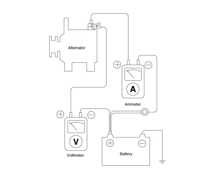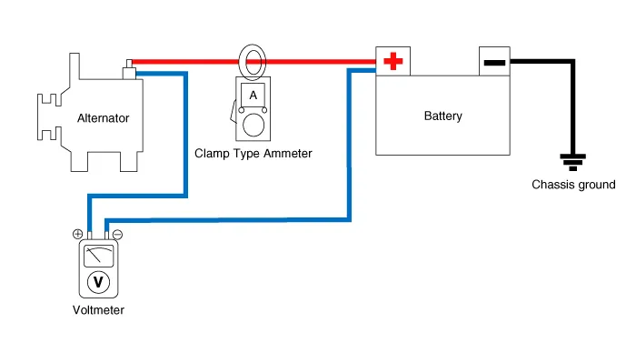 | The output current value changes with the electrical load and the temperature of the alternator itself.Therefore, the nominal output current may not be obtained. If such is the case, keep the headlamps on the cause discharge of the battery, or use the lights of another vehicle to increase the electrical load. The nominal output current may not be obtained if the temperature of the alternator itself or ambient temperature is too high. In such a case, reduce the temperature before testing again. |