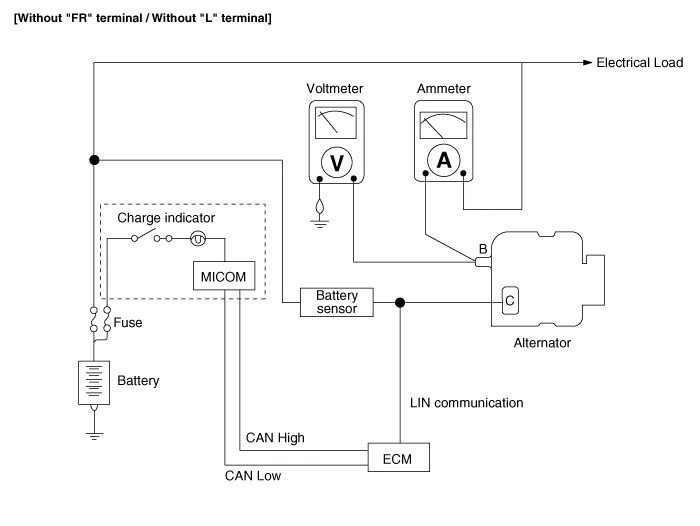 | 3. | Regulated Voltage Test The purpose of this test is to check that the electronic voltage regulator controls voltage correctly. | (1) | Preparation | a. | Prior to the test, check the following items and correct if necessary. Check that the battery installed on the vehicle is fully charged. The battery checking method is described in the section "Battery". Check the alternator drive belt tension. The belt tension check method is described in the section "Inspect drive belt". |