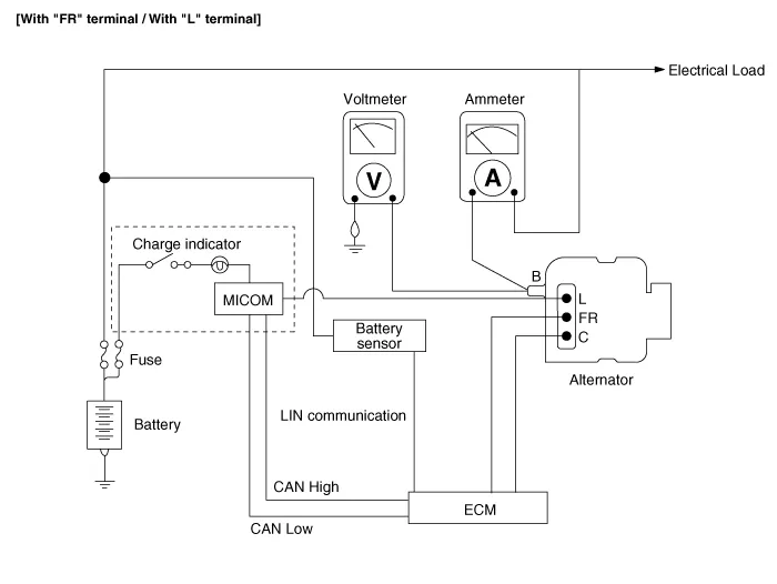 | The output current value changes with the electrical load and the temperature of the alternator itself. Therefore, the nominal output current may not be obtained. If such is the case, keep the headlamps on the cause discharge of the battery, or use the lights of another vehicle to increase the electrical load. The nominal output current may not be obtained if the temperature of the alternator itself or ambient temperature is too high. In such a case, reduce the temperature before testing again. |