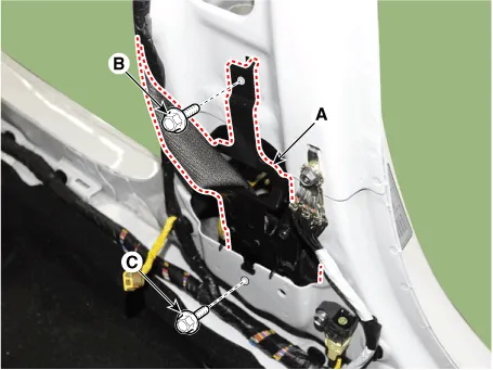 | 7. | Loosen the mounting bolts (B,C), remove the front seat belt pretensioner (A).