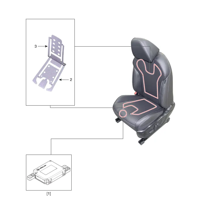 | 1. Seat heater unit (Passenger only) 2. Seat cushion heater | 3. Seat back heater |