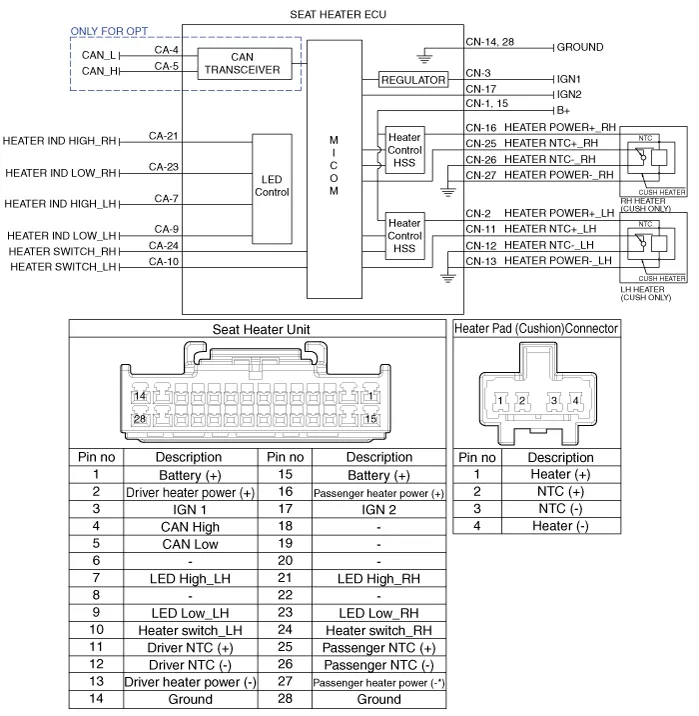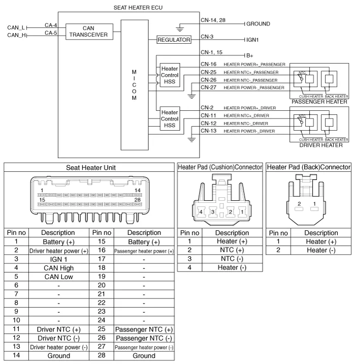 Components and components location Components1. Driver seat heater switch2. Passenger seat heater swtich3. 2nd seat heater switch Schematic diagrams Circuit DiagramManual Seat Heater SwitchConnector Pin Information[Connector A] Pin No Function Pin No Function 1Low (Register specifications)4Middle Low (Register specifications)2Common (Register specifications)5Middle High (Register specifications)3Ground (Register specifications)6High (Register specifications)[Connector B] Pin No Function Pin No Function 1Battery (+)21IGN22ISG B+22IGN13ILL+ (TAIL)23Blower IS (PWM specifications)4Sensor REF (+5V)24-5Mode control actuator (Feedback)25-6Temperature control actuator (Feedback)26-7Intake actuator (Feedback)27Blower Max.