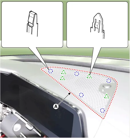 | 1. | Using a screwdriver or remover, remove the crash pad center speaker grille (A).