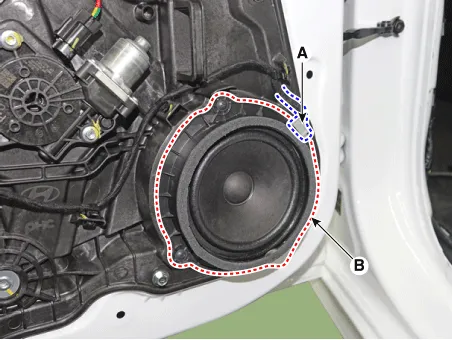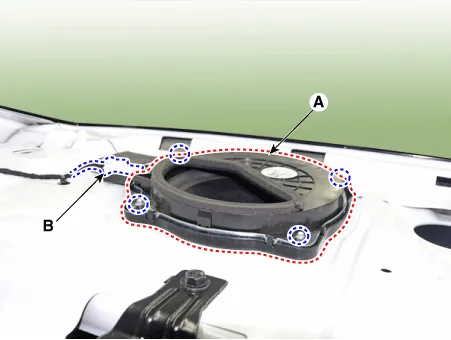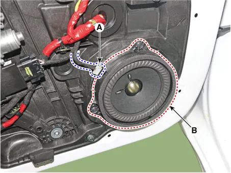 | 3. | Remove the front door speaker (B) after disconnecting the connector (A) and loosening screws.