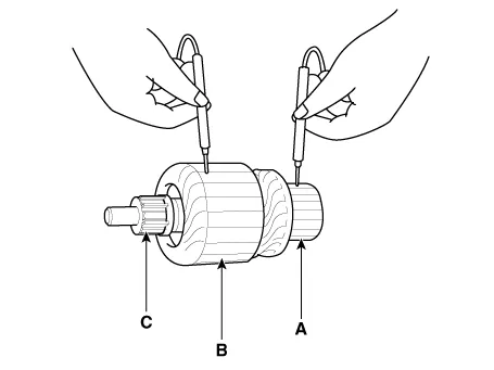 | 9. | Check with an ohmmeter that no continuity exists between the commutator (A) and armature coil core (B), and between the commutator and armature shaft (C). If continuity exists, replace the armature.