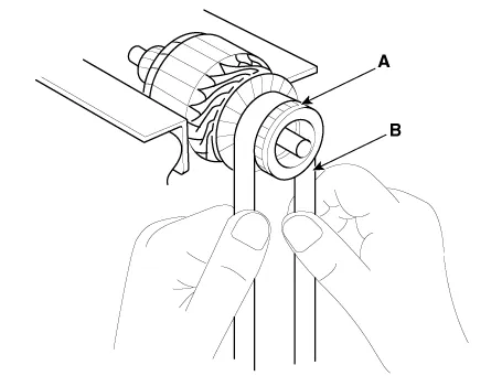 | 4. | Check the commutator (A) surface. If the surface is dirty or burnt, resurface with emery cloth or a lathe within the following specifications, or recondition with #500 or #600 sandpaper (B).