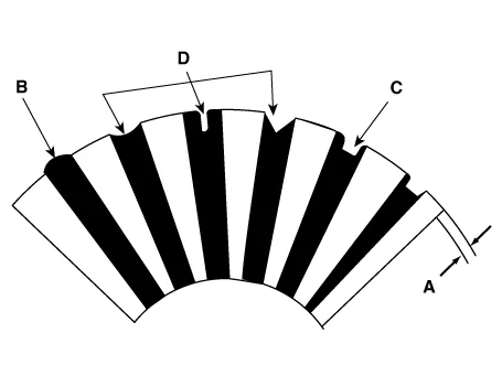 | 7. | Check the mica depth (A). If the mica is too high (B), undercut the mica with a hacksaw blade to the proper depth. Cut away all the mica (C) between the commutator segments. The undercut should not be too shallow, too narrow, or v-shaped (D).