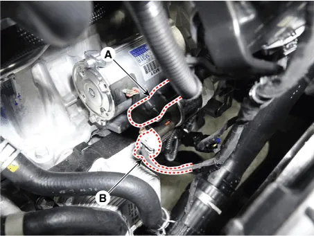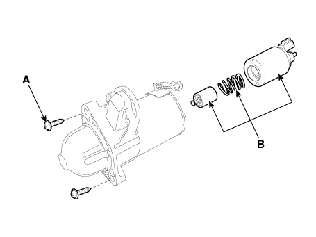 | 3. | Disconnect the starter cable (A) from the B terminal on the solenoid, then disconnect the connector (B) from the S terminal.