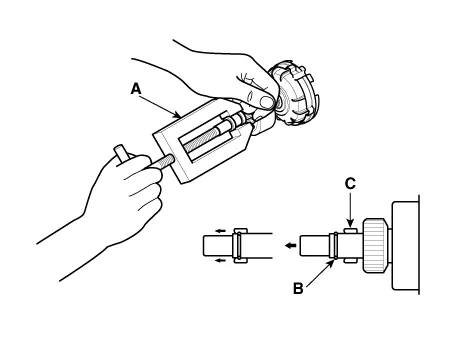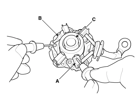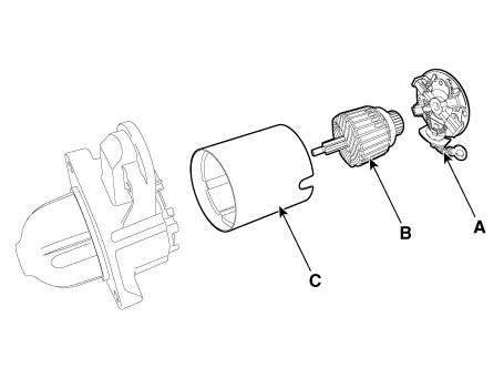 | 4. | Remove the brush holder assembly (A), armature assembly (B) and yoke assembly (C).
