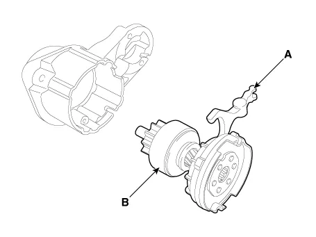 | 1. | Check that there is no continuity between the (+) brush holder (A) and (-) plate (B). If there is continuity, replace the brush holder assembly.