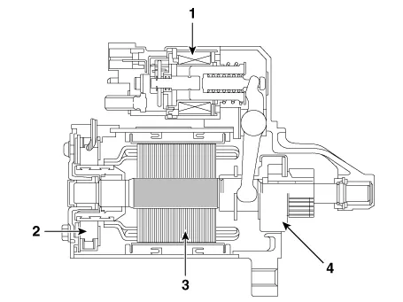 | 1. Solenoid 2. Brush 3. Armature 4. Overrun clutch |