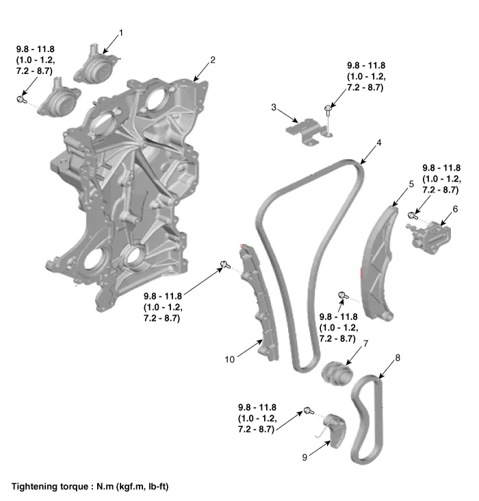 | 1. Variable force solenoid valves 2. Timing chain cover 3. Cam to cam guide 4. Timing chain 5. Timing chain tensioner arm | 6. Timing chain tensioner 7. Crankshaft sprocket 8. Oil pump chain 9. Oil pump chain tensioner 10. Timing chain guide |