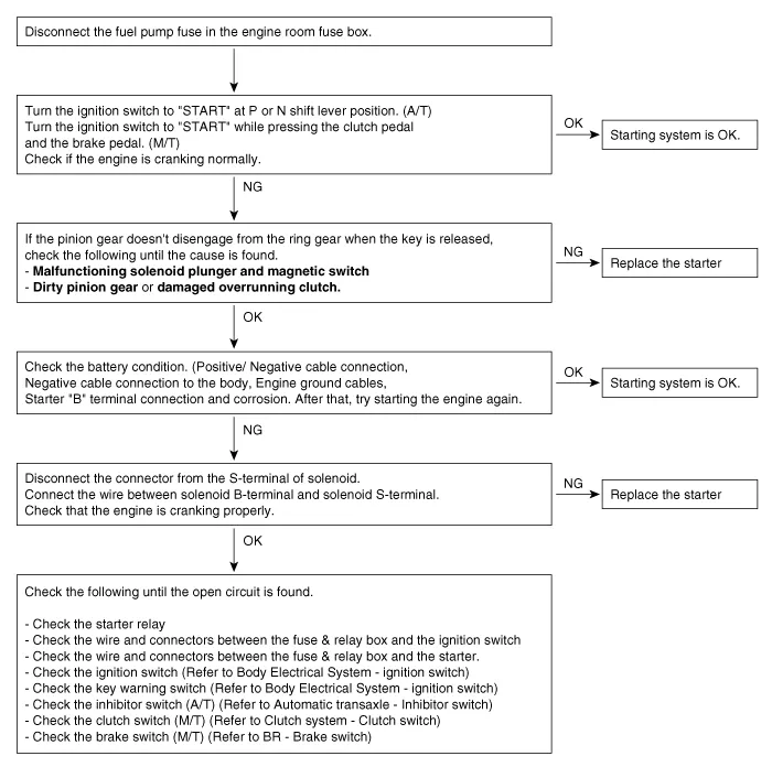 DescriptionThe starting system includes the battery, starter, solenoid switch, ignition switch, inhibitor switch (A/T), clutch pedal switch (M/T), ignition lock switch, connection wires and the battery cable.