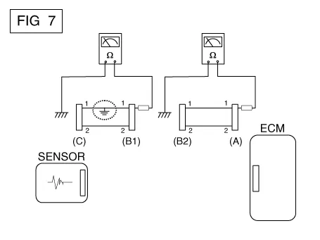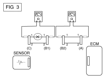 | b. | Disconnect connector (B), and measure for resistance between connector (C) and (B1) and between (B2) and (A) as shown in [FIG. 3]. In this case the measured resistance between connector (C) and (B1) is higher than 1MΩ and the open circuit is between terminal 1 of connector (C) and terminal 1 of connector (B1).