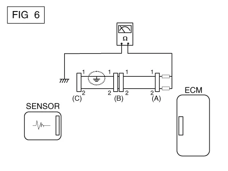 | 3. | Voltage Check Method | a. | With each connector still connected, measure the voltage between the chassis ground and terminal 1 of each connectors (A), (B) and (C) as shown in [FIG. 4]. The measured voltage of each connector is 5V, 5V and 0V respectively. So the open circuit is between connector (C) and (B).