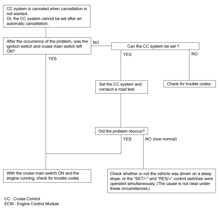 | CC system can be set while driving at a vehicle speed of less than 40km/h (25mph), or there is no automatic cancellation at that speed | Malfunction of the vehicle-speed sensor circuit | Repair the vehicle speed sensor system, or replace the part |