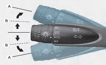 To signal a turn, push down on the lever for a left turn or up for a right turn in position (A). To signal a lane change, move the turn signal lever slightly and hold it in position (B). The lever will return to the OFF position when released or when the turn is completed.