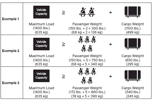 4. The resulting figure equals the available amount of cargo and luggage load capacity. For example, if the "XXX" amount equals 1400 lbs. and there will be five 150 lb. passengers in your vehicle, the amount of available cargo and luggage load capacity is 650 lbs. (1400 - 750 (5 x 150) = 650 lbs.)