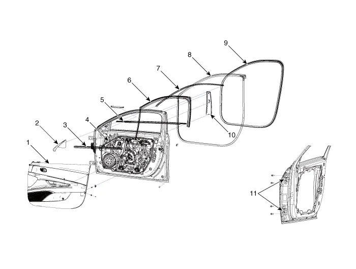 | 1.Front door trim 2. Front door quadrant inner cover 3. Front door belt inside weatherstrip 4. Front door module 5. Front door belt outside weatherstrip | 6. Front door window glass run 7. Front door frame molding 8. Front door body side weatherstrip 9. Front door side weatherstrip 10. Front door frame garnish 11. Front door hinge |