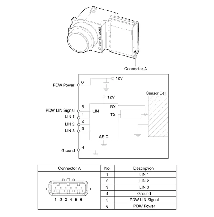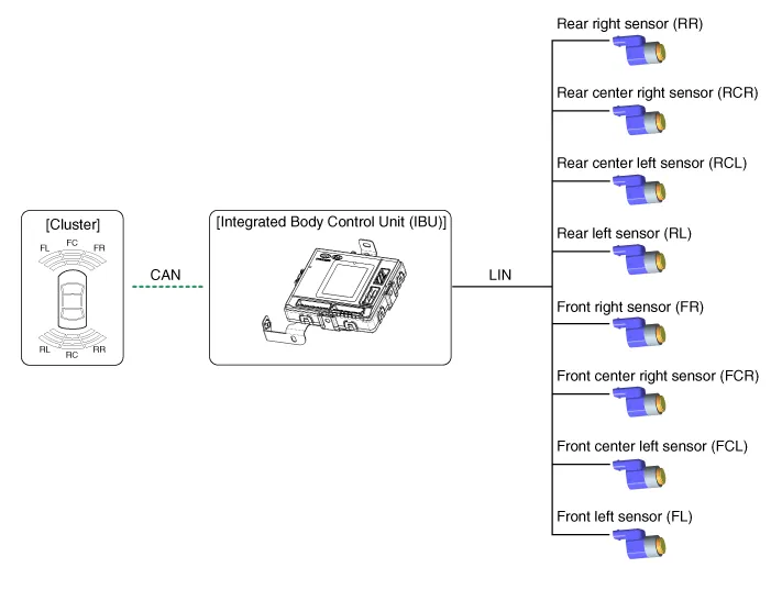 | • | PDW consists of 8 sensors (front : 4 units, rear : 4 units) that are used to detect obstacles and transmit the result in three separate warning levels, the first, second and third to IBU via LIN communication. |